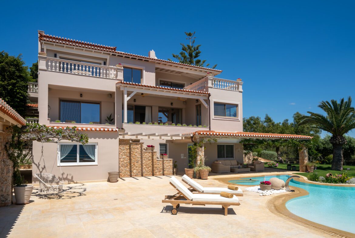 Upon entry, floor-to-ceiling windows frame an awe-inspiring panorama, showcasing the endless azure expanse and the charming island of Spetses in the distance. The interior, adorned with contemporary furnishings and adorned in tranquil neutral tones, establishes a serene ambiance ideal for a family retreat.
